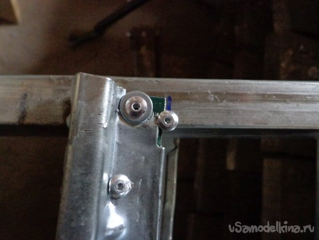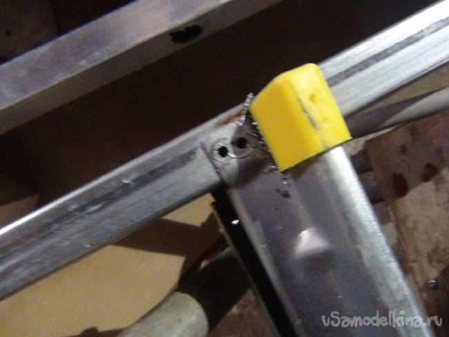 Использовал длинные заклёпки 4х12, длины как раз хватало для того чтобы, просверлить отверстие в профиле для фиксации трубок.