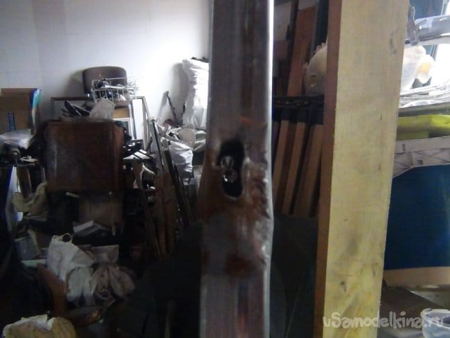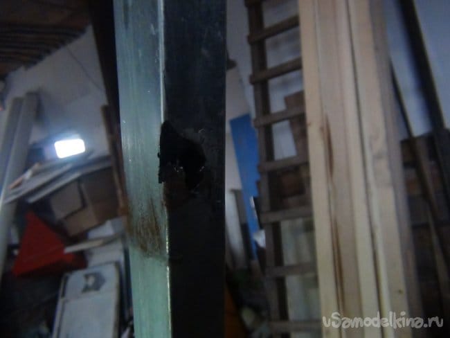 При попытке рассверлить сверлом по металлу как 4 так и 5 мм толком не удалось, само сварное пятно оказалось больше в диаметре. Чтобы оторвать начал ковырять старой сломанной отвёрткой, только хуже сделал в одном месте прорвал сам профиль, а в другом никак не удавалось сорвать и решил болгаркой срезать, и не заметил что прорезал больше чем требовалось повредив при этом саму стойку лесенки, проф.трубу. В двух местах удалось сорвать точечную сварку, что порадовало.