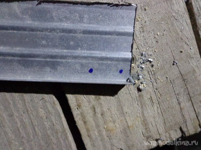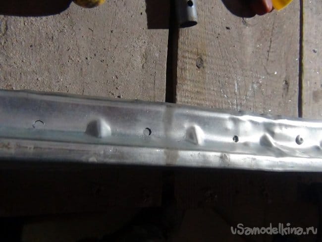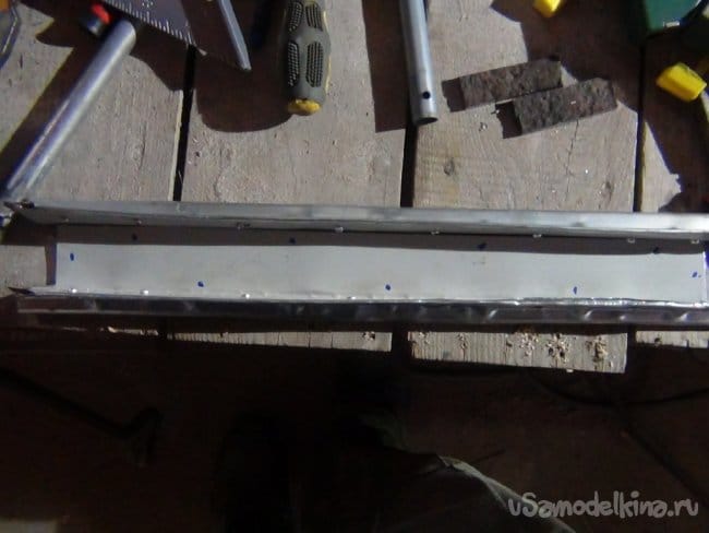 Сами пластинки буду делать длинной 6 см и по ширине проф.трубы. Разметил на куске трубы как будут сверлиться отверстия для заклёпок и самих трубок. Решил сначала просверлить, а уже потом вырезать болгаркой. так проще, чем сначала вырезать, а потом пытаться в пластинках просверлить нужные отверстия, это не удобно, а сверлить 16-ым сверлом, так вообще будет проблема.