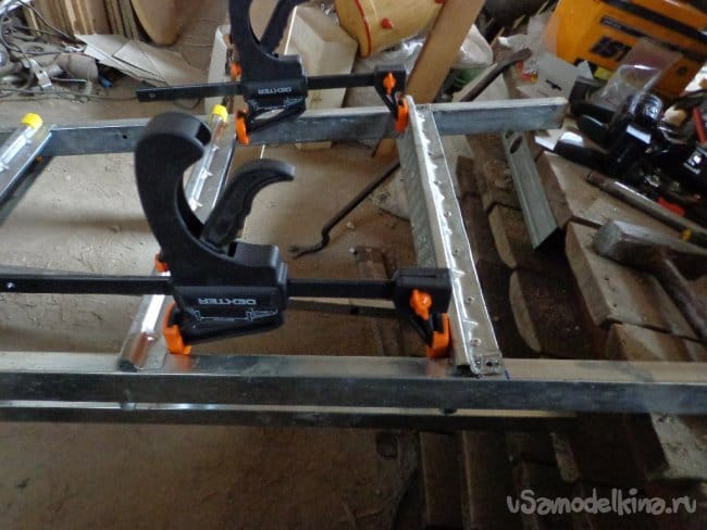 Чтобы уголки не сместились сразу при сверлении отверстий под заклёпки, я сначала просверлил одну посередине и поставил заклёпку, а затем уже не боясь что что-то сдвинется насверлил все дырки и разом проклепал остальные отверстия по обеим сторонам