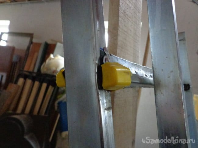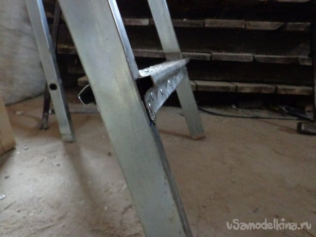 Дополнительную прочность придаст установка клёпок на поверхности порога, куда ставится нога при подъёме по стремянке.
