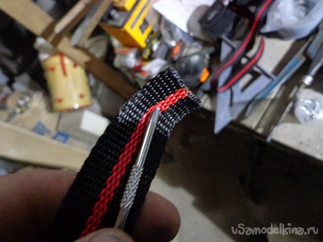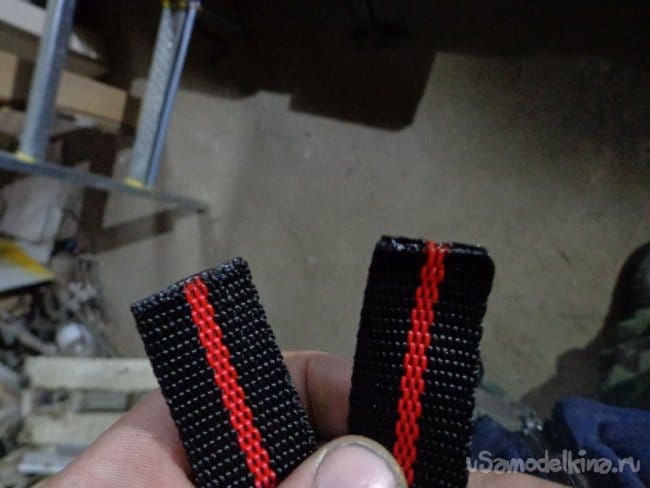 Отрезал 2 куска длинной 78 см, по 1.5 см запаса с каждой стороны. Лохматые края оплавил обычным паяльником, чтобы не растрёпывались концы.