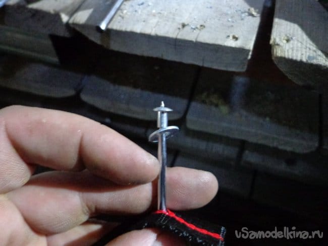 Чтобы поставить заклёпку, проткнул шилом в месте где будет продеваться клёпка.
