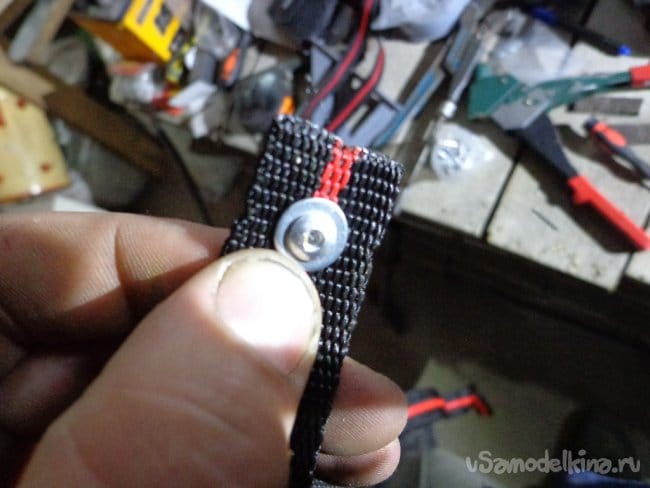 Конец в который входит штырь вставил шило и сместил клёпку к ремню, так она значительно легче продёрнулась, нежели просовывал её в собранном виде. И установил на места где раньше были заводские клёпки.