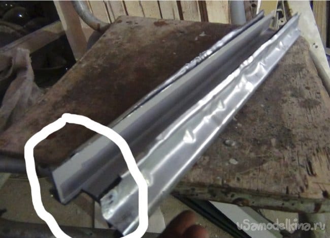 Теперь предстояло придумать как усилить гнутый порог. Это процедура необходима из-за того что, метал уже подвергся механической деформации и если его вернуть на место без усилителя то он неизбежно прогнётся обратно, вся работа по рихтовке будет напрасна.