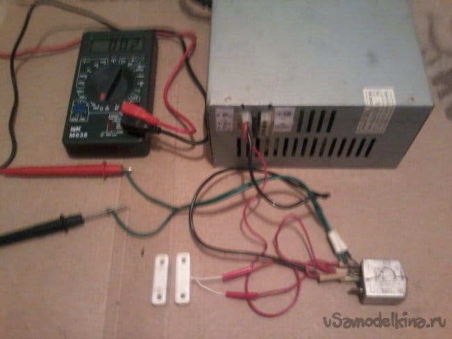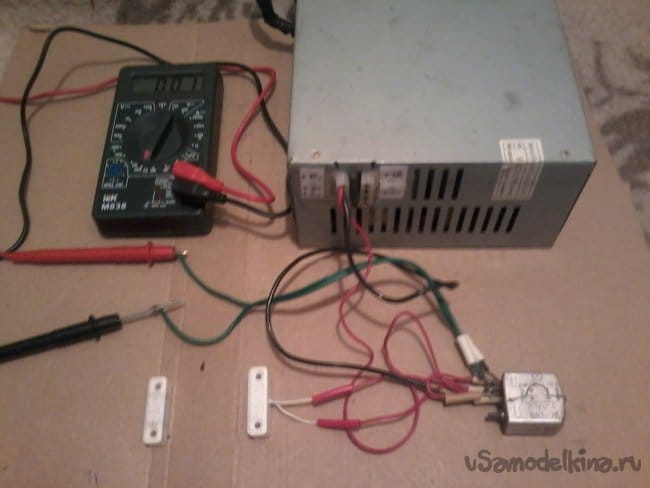 Плюс питания – на геркон, а минус – на один вывод обмотки реле К 1. К контактам К1.2 подключаем мультиметр в режиме измерения сопротивлений.