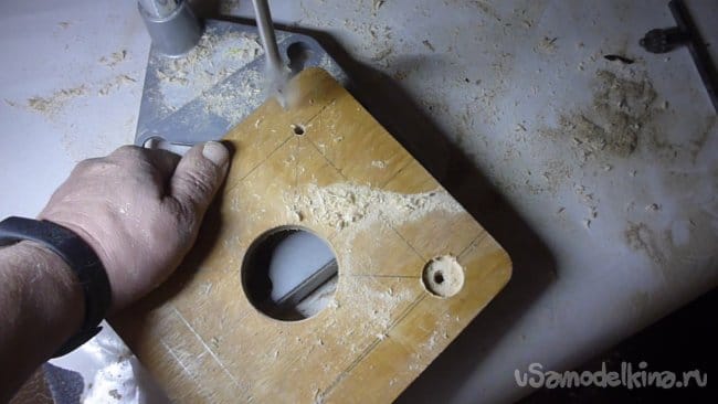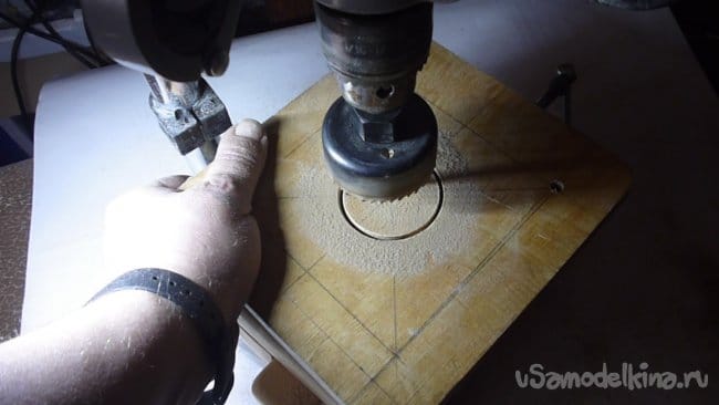 7. Вырезаем из ЛДСП, с помощью корончатого сверла, диски для изготовления абразивного барабана.