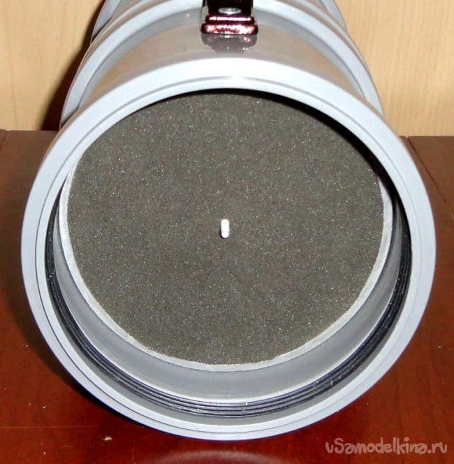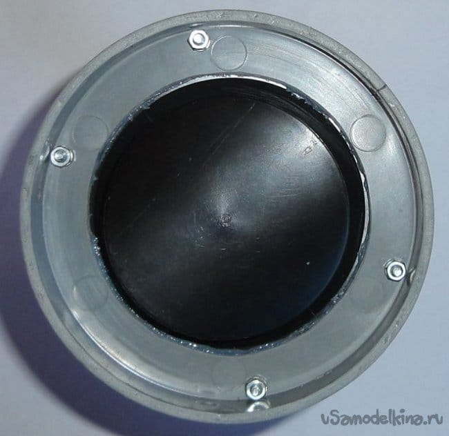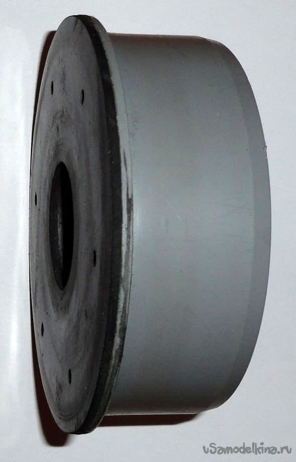 Корпус фильтра изготовлен из стандартной заглушки d 110мм. Прокладка вырезана из листовой резины толщиной 2мм и приклеена клеем «Момент». В качестве уплотнителя использована изолента. Для удобства извлечения из корпуса и возможности дополнительного крепления поролонового фильтра в центре закреплен винт М3.