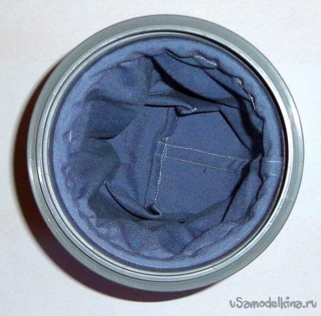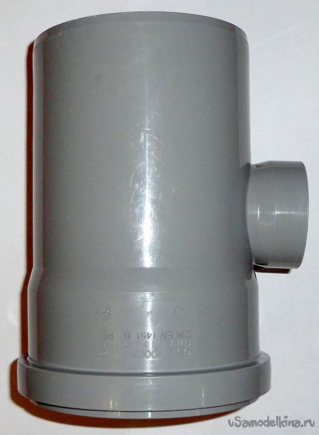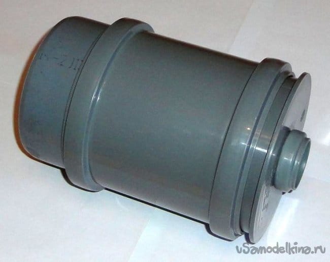 Дополнительный пылесборник изготовлен из соединительной муфты d 110мм, отрезка трубы d 110мм длинной 125мм, заглушки d 110х40мм, фрагмента трубы d 32мм с уплотнительным кольцом. Фильтр сшит из х/б ткани. В край фильтра вшито кольцо, вырезанное из трубы d 110мм. По центру заглушки термоклеем вклеен фрагмент трубы d 32мм с уплотнительным кольцом.