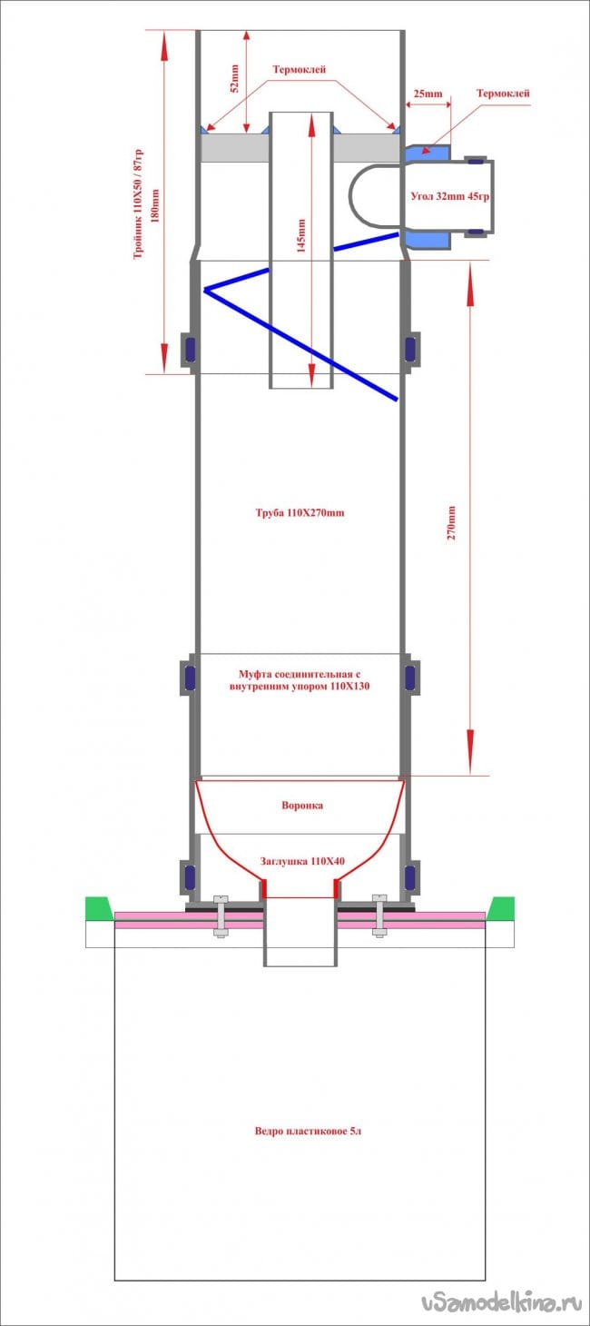 Блок «Циклон» состоит из блока вихрь-генератора и емкости для сбора опилок. Корпус вихрь-генератора собран из тройника d 110х50/87гр, отрезка трубы d 110х270мм, муфты соединительной с внутренним упором d 110мм, заглушки d 110х40мм. Емкость для сбора опилок собрана из двух пластиковых ведер емкостью 5Л.
