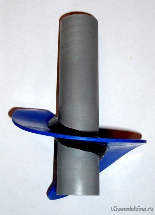 В отличие от предыдущей версии лопасть вихрь-генератора изготовлена из более толстого пластика толщиной 2,5мм. Лопасть изогнута с помощью строительного фена и закреплена на трубе d 32мм длинной 145мм термоклеем. Труба плотно вставлена в кольцо и зафиксирована термоклеем.