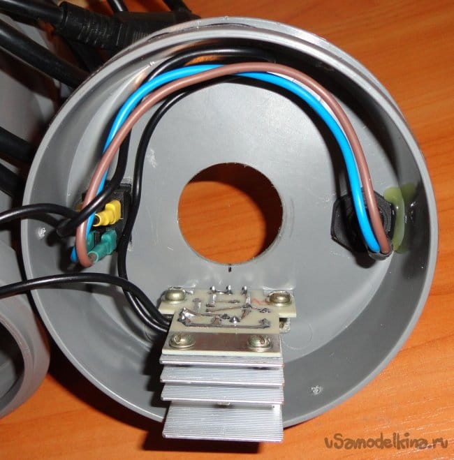 Для удобства разборки заглушка крепится в корпусе тремя саморезами 3мм. Уплотнение сделано изолентой. В отличие от предыдущей версии сетевой провод крепится через кабельный ввод «PG7», что на много удобнее. Регулятор мощности крепиться двумя винтами М4 и гайкой потенциометра. Для удобства замены выключатель подсоединен на ножевых разъемах.
