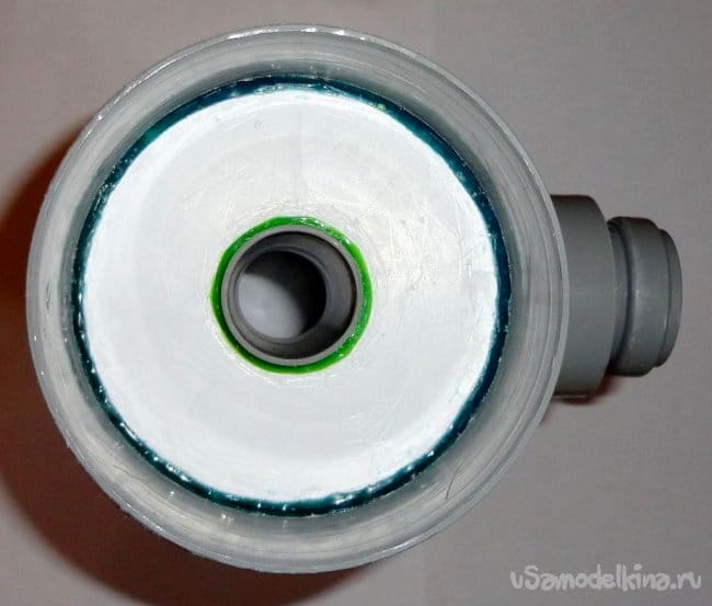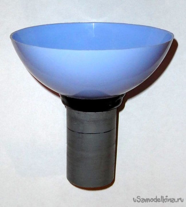 Воронка обрезана по внутреннему диаметру соединительной муфты. Горлышко воронки изготовлено из соединительной муфты d 32мм и закреплено на корпусе воронки термоклеем.