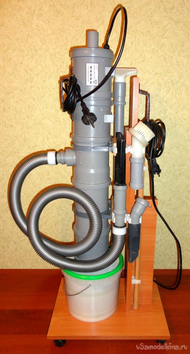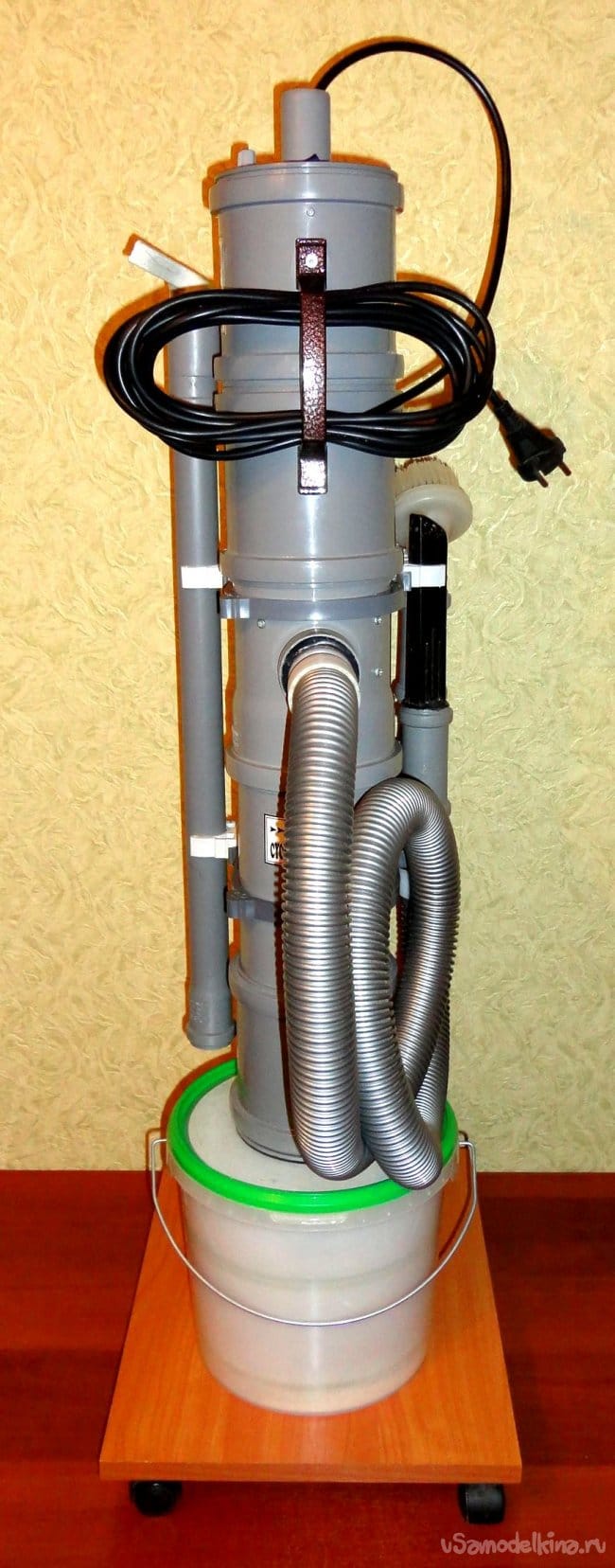 Идея была, сделать конструкцию более удобной, надежной. Использовать в конструкции детали из ближайшего строительного магазина, чтоб не было проблем с заменой. Повысить удобство обслуживания системы (очистка, сборка, разборка). Поэтому изменилась конструкция, как универсального пылесоса-воздуходувки, так и самого блока «Циклон». Добавлен дополнительный пылесборник. Предыдущая конструкция до сих пор с успехом продолжает использоваться знакомыми. У меня от нее осталась только тележка (станок) и блок синхронного пуска.