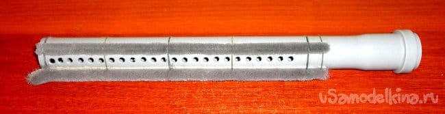 Для уборки пыли с ЖК-панелей, радиоаппаратуры, оргтехники, в труднодоступных местах и т.д. Изготовлена специальная щетка типа «Флейта» d 32мм, длинной 350мм. В качестве заглушки на конце трубы вклеена игральная шашка. В качестве мягких щеток использован уплотнитель щеточный самоклеющийся для шкафов, который дополнительно зафиксирован толстой нитью. Диаметр отверстий 5мм. Край уплотнителя немного выходит за край трубы, для уборки пыли из углов.