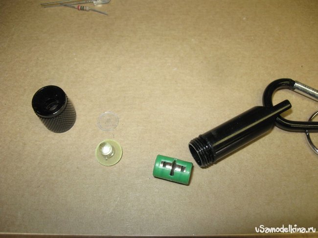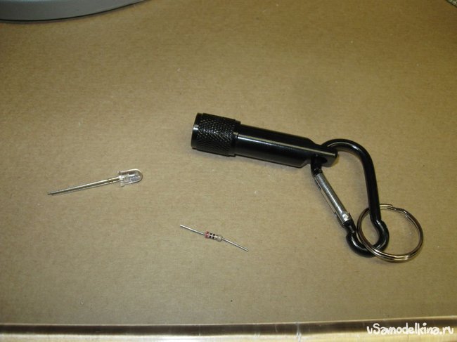 Возьмите ярко-красный или зеленый диод, замените им белый, как показан она фотографиях, и присоедините резистор.