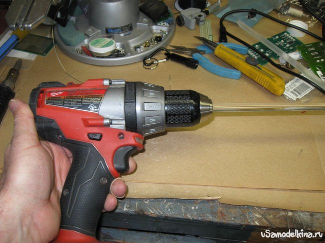 Вам понадобится закрепить другой конец стержня в дрели, чтобы обработать основание. Основание должно приобрести форму для закрепления в корпусе фонарика, поверх подрезанного диода.