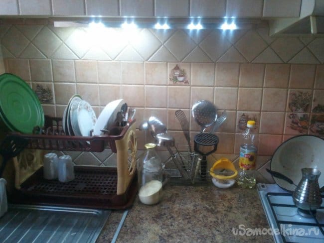 Вот и все, самоделка готова, смотрится все великолепно - освещает, но не ослепляет. К тому же, светильник своим корпусом выполнил и эстетическую задачу - закрыл дырку в стене, откуда выходил кабель питания.