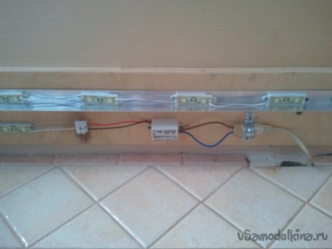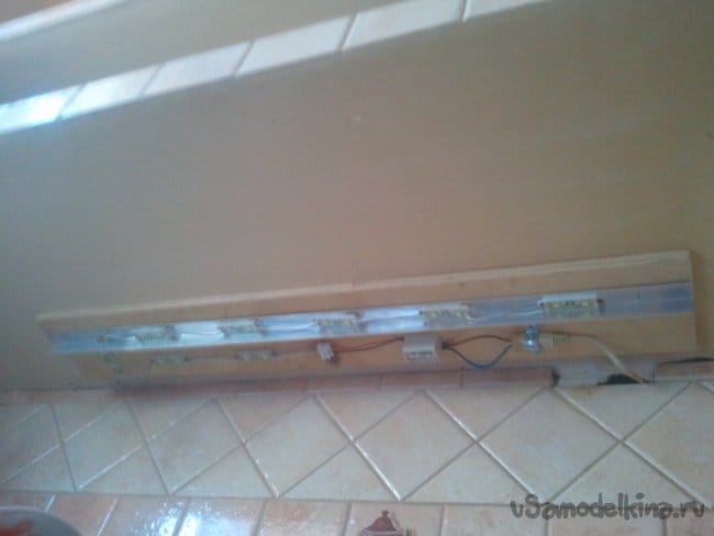 Сверлим в фанерной основе два сквозных отверстия и двумя шурупами закрепляем светильник по месту. Подключаем светильник к электросети.