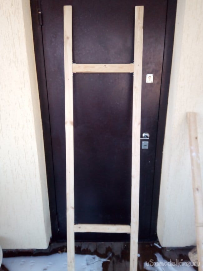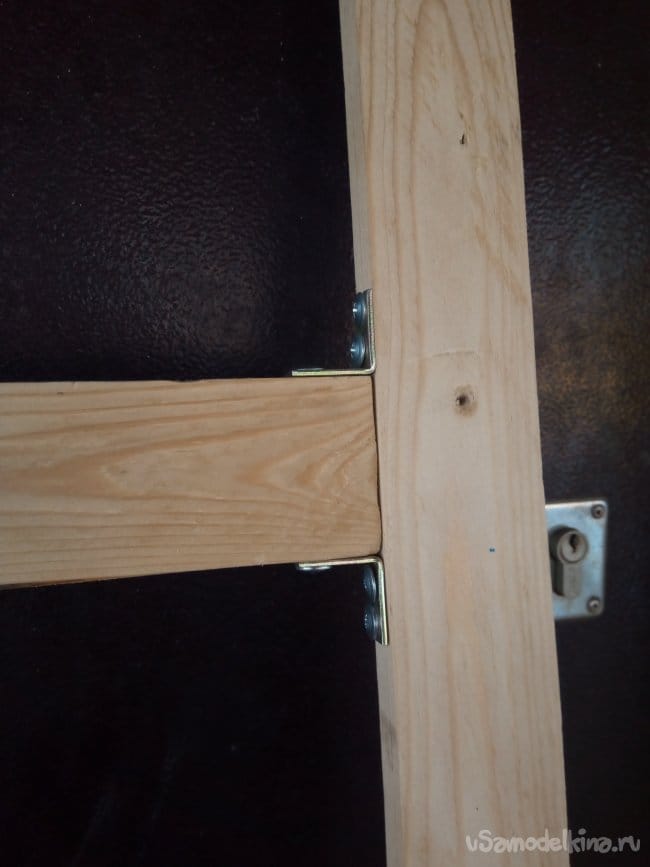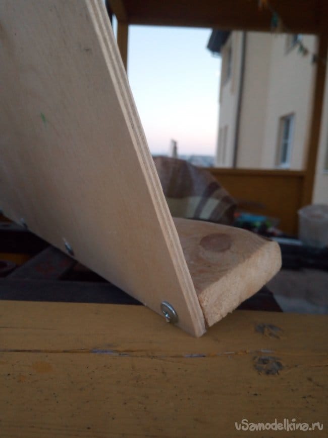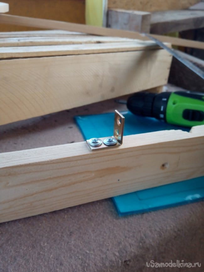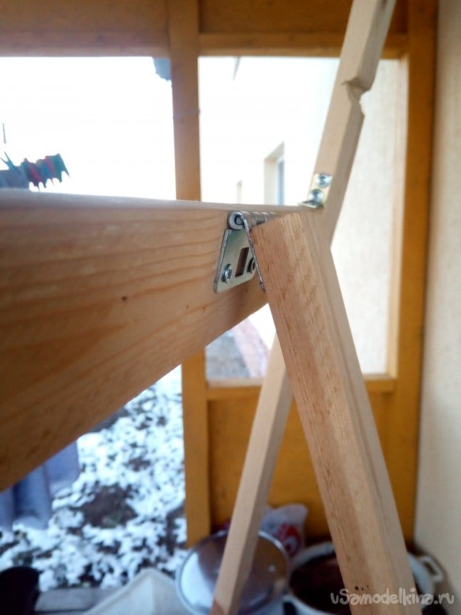 Теперь скручиваем все как показано на чертеже. Перепорки крепим на расстоянии 40 см от каждого края ножек. Прикручиваем перепорки на уголки с двух сторон ради большей надежности. Кстати я использовал доски (рейки ) 10мм на 50мм. Заднюю ножку крепим на петлю