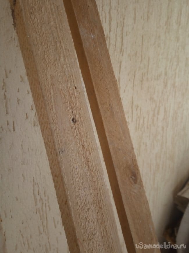 Теперь давайте сделаем само рабочее полотно. Как было сказано выше размеры доски будут 750мм * 500мм. Вполне логично, что при черчении или рисовании нужно будет куда-то положить карандаш и стерку. Для этого отрежем и зашлифуем ( если надо) отрезок рейки длинной 0,5 метра. Следом прикрутим ее к фанере на саморезы с обратной стороны, тем самым образовав небольшую полочку. Куда можно положить канцелярские принадлежности.