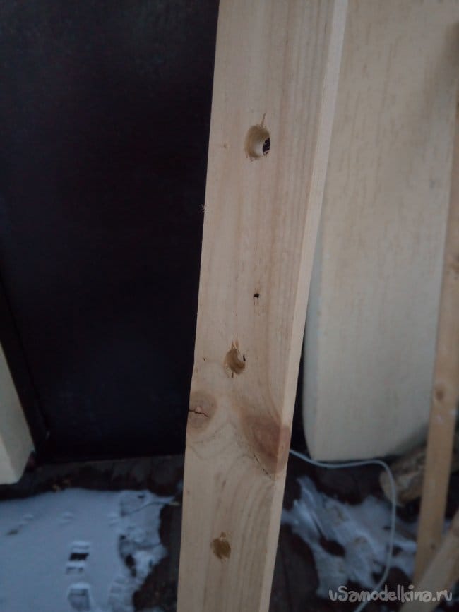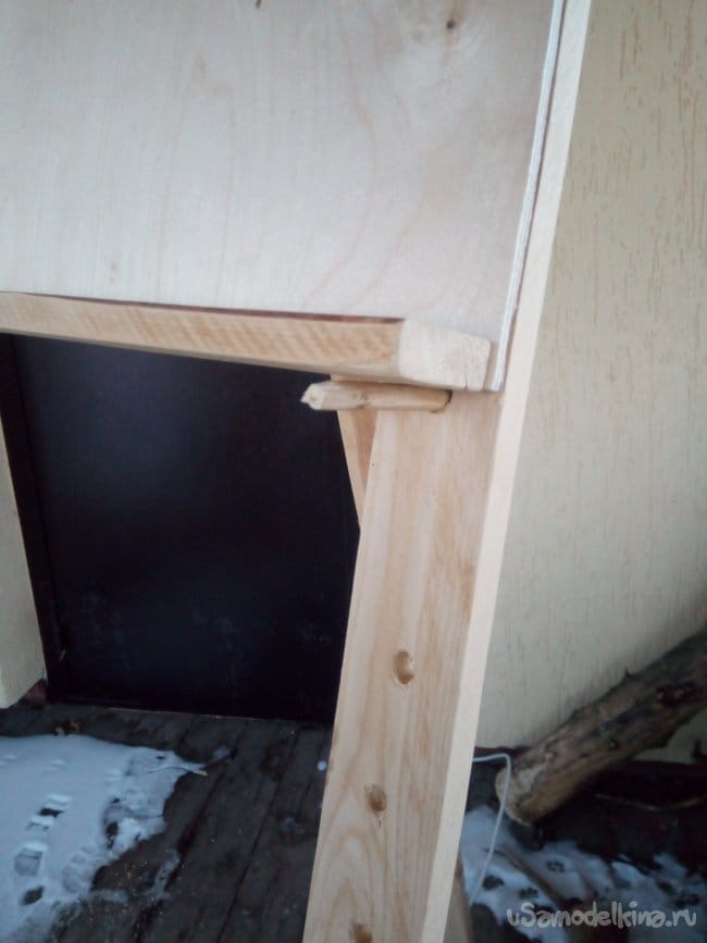 Сейчас давайте сделаем регулировку высоты. Уйдем от сложных механизмов во имя простоты и удобства. Я считаю можно сделать регулировку стола куда проще. Достаточно насверлить отверстий на главных ножках через каждые 10 см и на нужной вам высоте просто вставлять болты или что-то другое в отверстия. Что и зафиксирует доску на необходимой вам высоте.