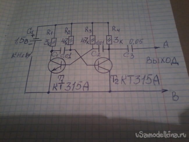 Это: два транзистора КТ 315А, Резисторы МЛТ – 0,25 вт 3 ком – 2шт, 47 ком – 2шт, конденсаторы 0,01мкф -2шт, 0,05 мкф – 1шт, любая малогабаритная кнопка, батарейка на 1,5 в, один зажим «крокодил».