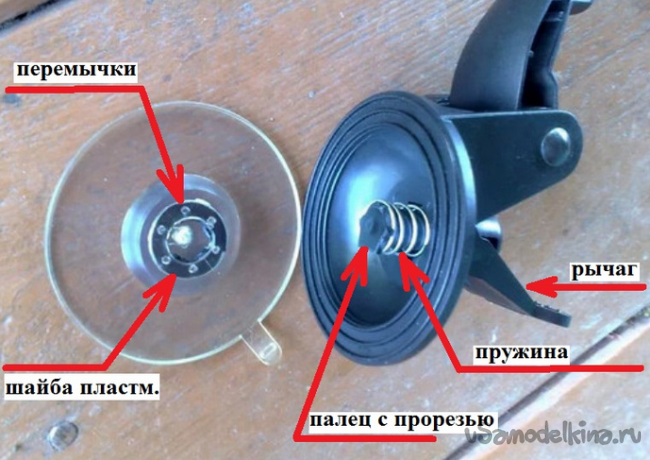 1.Выковыриваем из присоски всю начинку: пластмассовое кольцо, палец с прорезью, пружину и рычаг «фото 04, кликабельно». Всё это в мусор.