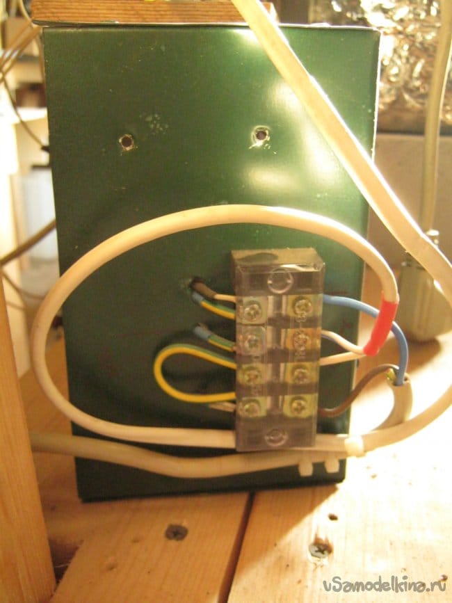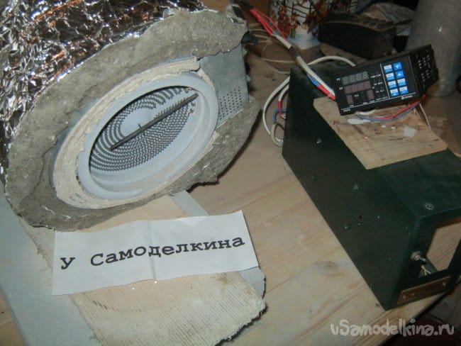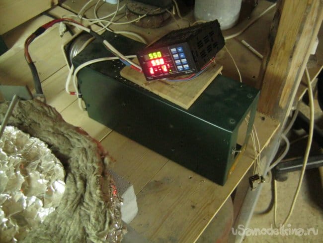 Здесь, термоконтроллер, для проверки был подключен на живую нитку к старому блоку управления. Вместо контроллера обычного, однотемпературного, не программного. Контроллер не установлен в корпус как положено – это только проверка работоспособности прибора и идеи. В дальнейшем, контроллер будет работать с новой, несколько большей печью, в своей коробке, с трехфазной нагрузкой.