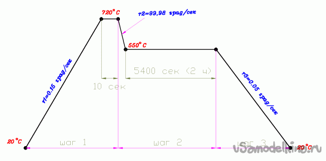 Применение программируемого термоконтроллера, способного самостоятельно поддерживать внутри печи нужный термопрофиль, кроме полной автоматизации – смены температур в нужный момент, вполне решает и описанную задачу. То есть, скорость изменения температур (и ее постоянство) задается и очень точно контролируется. По крайней мере, те, которые способна обеспечить печь. Наши две главные скорости – первоначального нагрева и остывания в конце процесса удается задавать и регулировать в нужных пределах в полной мере. То есть в простой, легкой (масса) и недорогой печи из современных огнеупорных материалов, например «керамического одеяла», можно создать условия остывания как в массивной из сплошного шамота. Более того, в течение одного непрерывного процесса, можно запрограммировать их разными (например - r2 и r3, см. термопрофиль выше). Это упрощает, удешевляет, облегчает и в то же время расширяет. Очень.