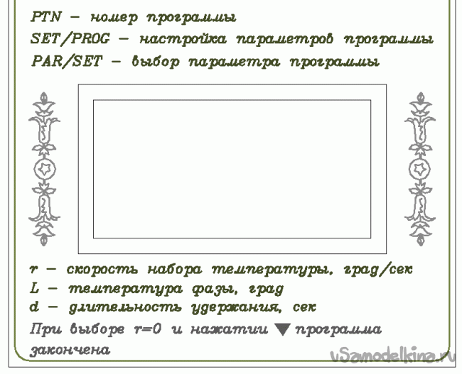 То есть программа состоит из нескольких шагов, каждому шагу соответствует три параметра: L- нужная температура; d – время ее удержания; r – скорость ее нарастания. Ага – раз-два-три, раз-два-три, раз-два-три… Остальное очевидно.