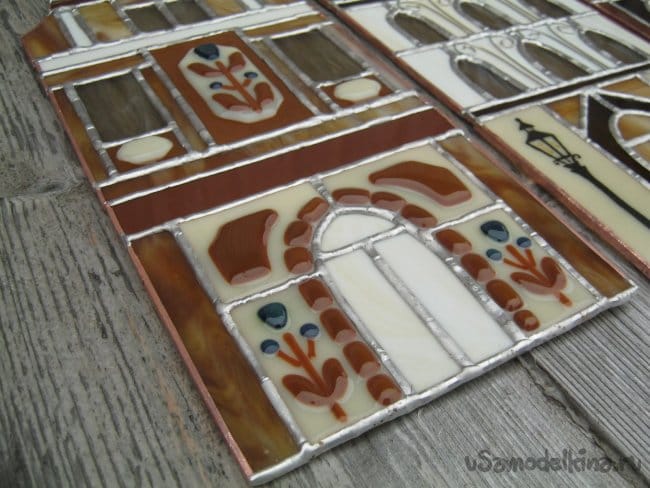 Фото 3. Пример деталей выполненных в технике фьюзинг, в описываемой печи. Фото 1,2 – заготовки; фото 3 – готовые детали, установленные в витражный абажур светильника.