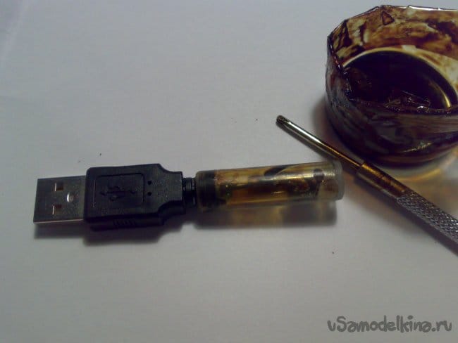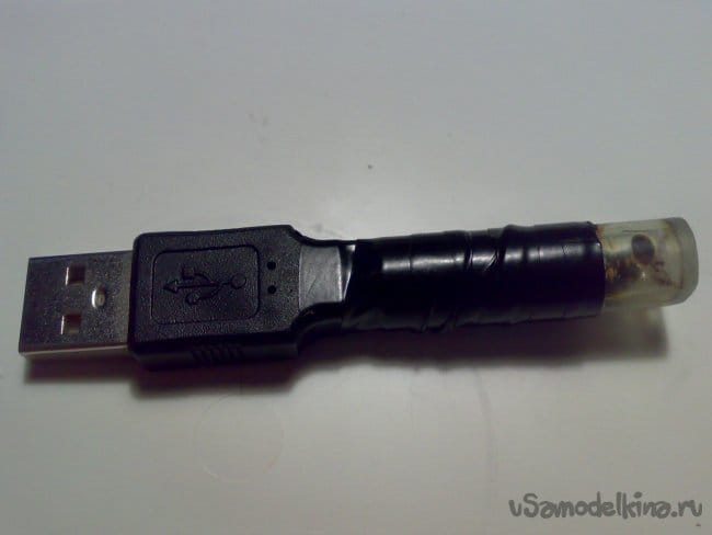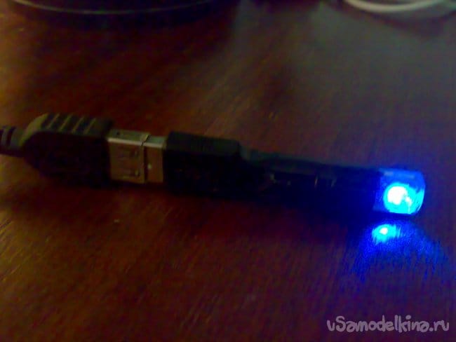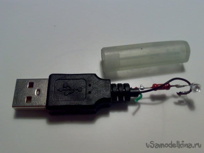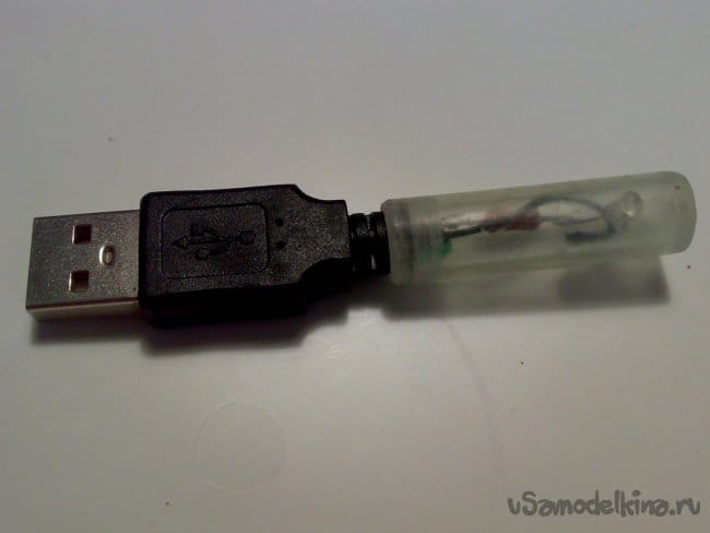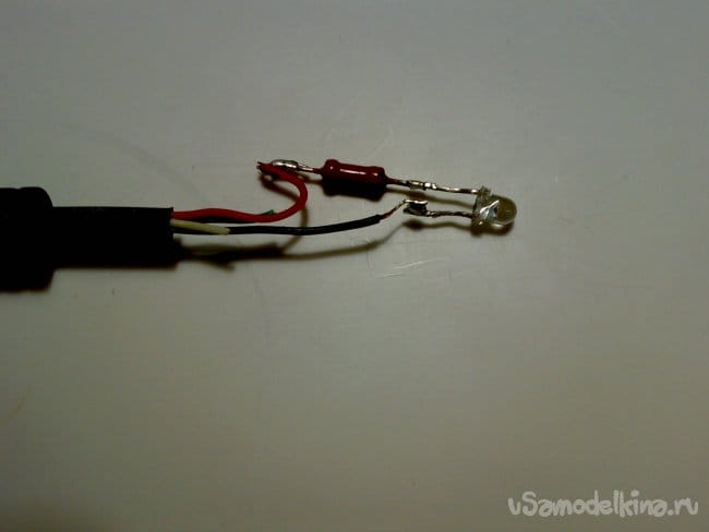 Выводы светодиода я изогнул под 90 градусов и расположил светодиод таким образом, чтобы он светил в ту же сторону, куда "смотрит" символ USB на разъёме "трезубец", то есть, на того, кто включает пробник в гнездо.