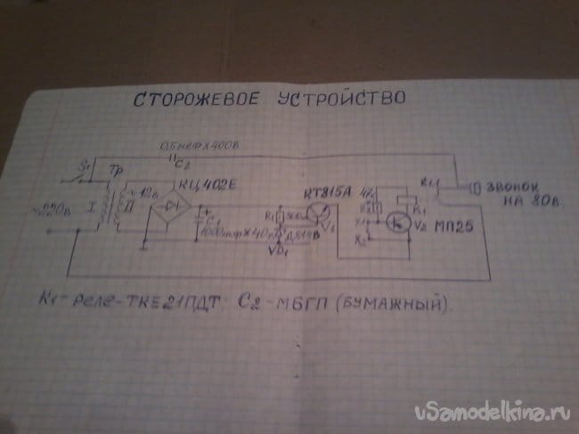 Шаг -3. Налаживаем устройство . На выходе блока питания должно быть 9 в. Подбираем резистор R2, при отключенном шлейфе должно надежно срабатывать реле К1. При налаживании вместо шлейфа можно подключить любой тоненький провод. После того, как добились чтобы реле надежно срабатывало, подключаем к зажимам «Х1 и Х2» любой провод длинной 20- 30 см. Транзистор должен закрыться и отключится звонок. Если будет все как я написал, то налаживание закончено.