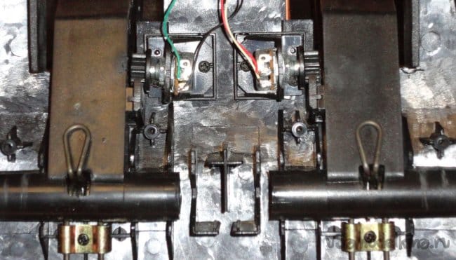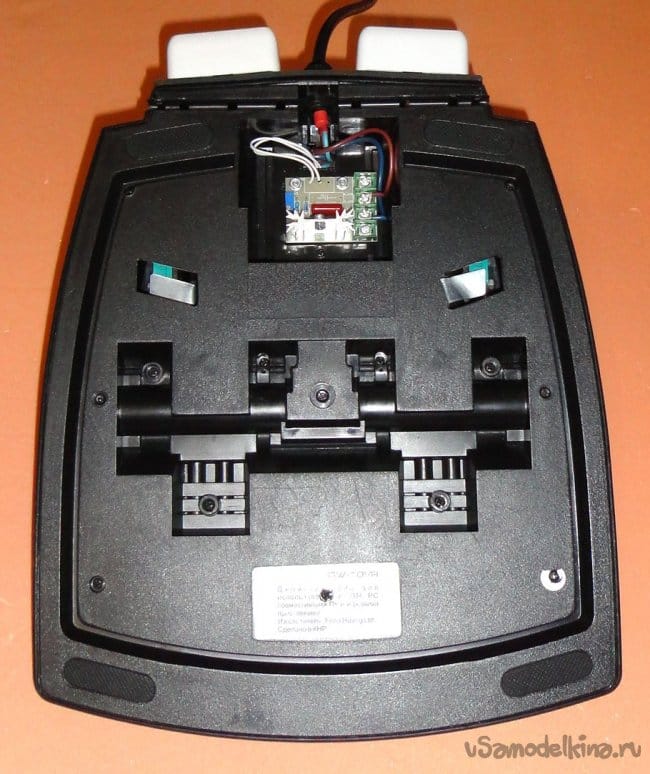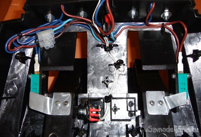 Сетевой провод подключается через клеммник (для удобства замены). Микропереключатели подключаются с помощью ножевых разъемов, используются контакты, замыкающиеся при отжатии кнопки. Т.к. полный ход педалей не обеспечивает максимальный поворот вала переменного резистора, то при его закреплении на корпусе, шестерня установлена так чтобы при полностью отжатой педали было максимальное значение сопротивления (500кОм). При полностью нажатой педали сопротивление 27кОм. Данного диапазона вполне хватает для нормальной работы. Была идея параллельно переменному резистору R5 подключить геркон, а на педали закрепить магнит, выставив расстояние срабатывания при полностью нажатой педали. Но пока у меня нет в этом необходимости. Вполне хватает смещения диапазона регулировки с помощью подстроечного резистора R4.