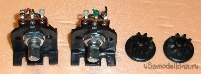 В конструкции переменный резистор заменен на 500 кОм (был на 50 кОм). Поскольку в заначке нашелся подходящий переменный резистор только с круглым валом, пришлось стачивать фаску. В разрез вставлен пластиковый клин.