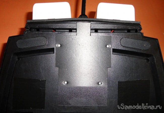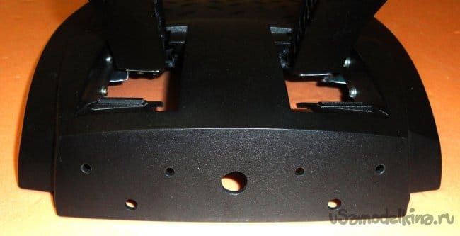 В нижней части корпуса пришлось вырезать отверстия. Они не позволяют металлическим пластинам на педалях, упираться в нижнюю часть корпуса при полном нажатии на педали. В результате педали упираются исключительно в резиновые упоры на верхней части корпуса. При этом металлические пластины немного не доходят до наружного края нижней части корпуса (на 1-1,5мм).