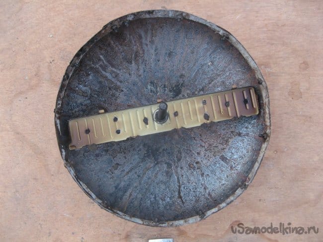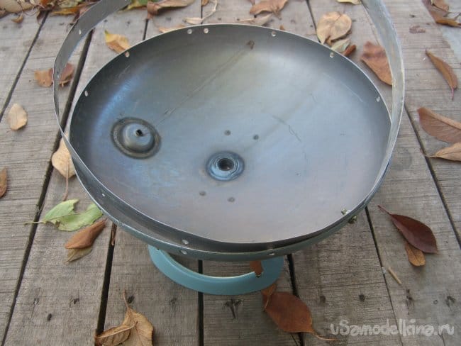 Прикручиваю полосу на винты . Без шайб и гроверов. На улице пойдет и такой вариант. Сразу установил шпильку. Обрезать ее не стал, позже прикручу площадку под мясо. Такая себе «спутниковая тарелка» получилась.