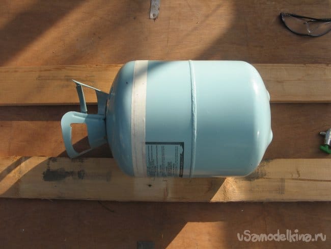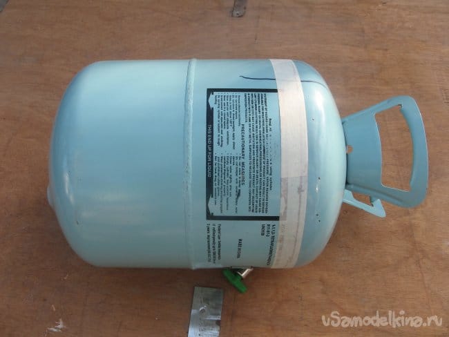 Самый стандартный баллон от фреона. На СТО их множество, так же они есть у заправщиков холодильников. Цвет не принципиален. Для разметки ровного распиливания, я использовал бумажный скотч. Можно взять бумажную ленту или еще что-либо. Так же открутил кран. Баллон, с открытым краном, лежал у меня вверх дном.