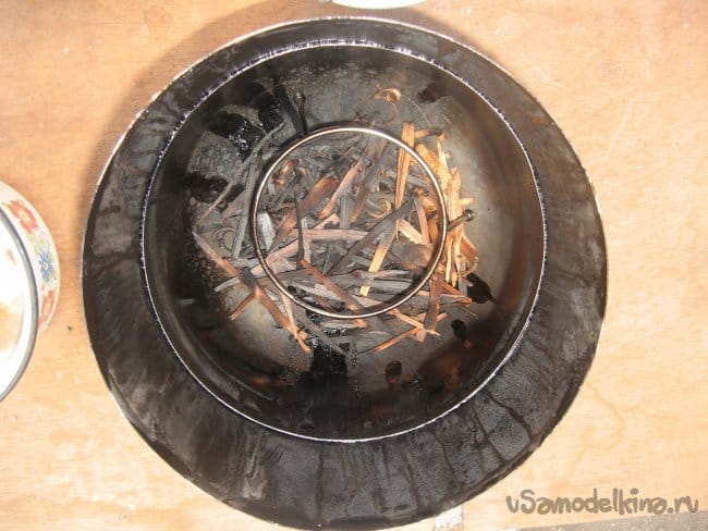 Ставить сковороду буду на подставку от ночника. На дно коптилки укладываю щепки из плодового дерева.