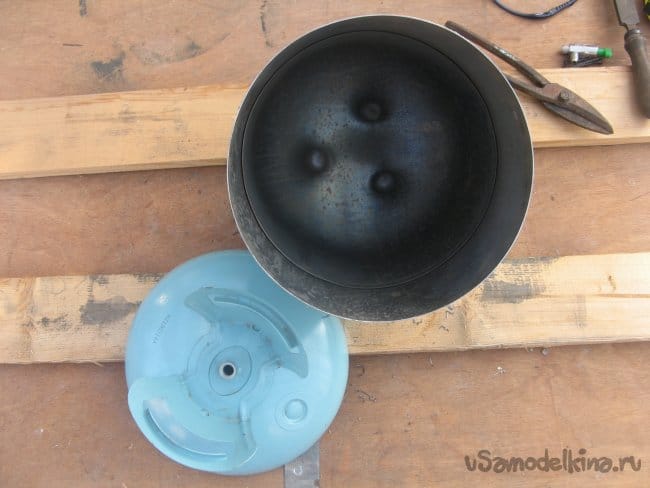 Отпиливаем часть баллона болгаркой. Обязательно применять защитные очки. Получилось две половинки. Меньшая будет являться крышкой.