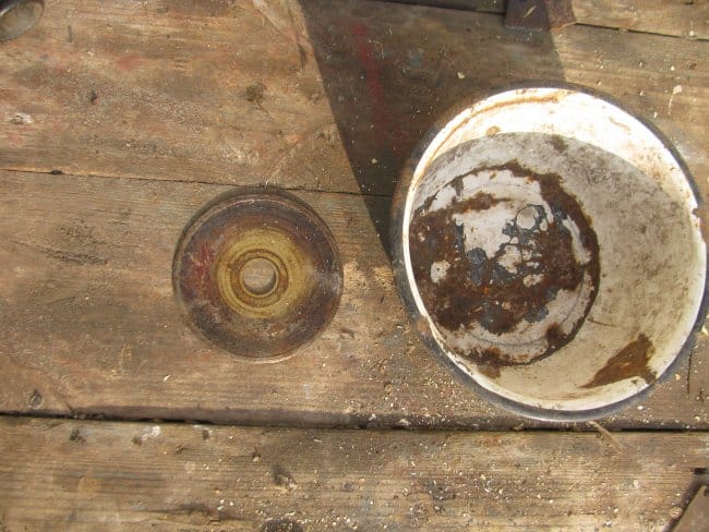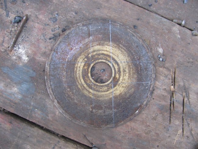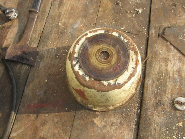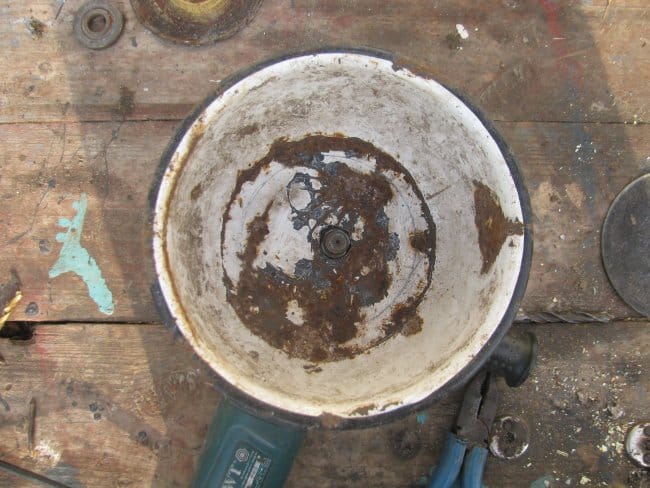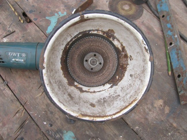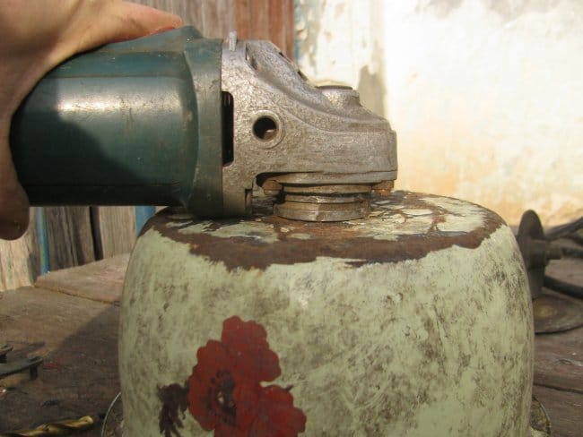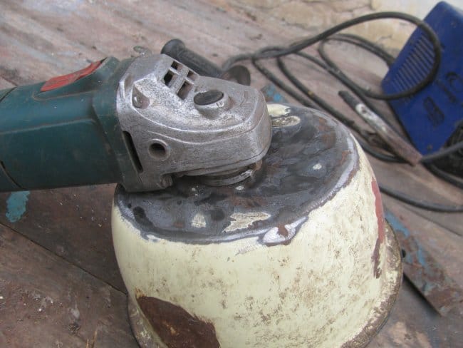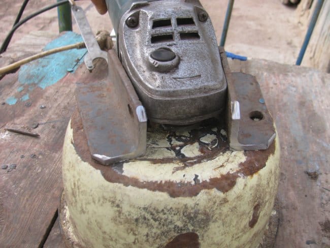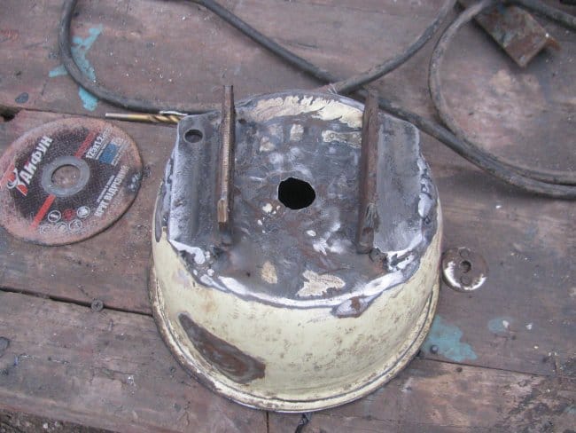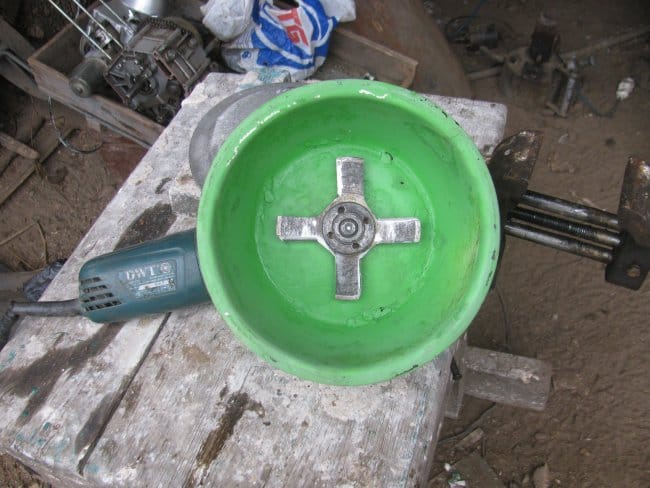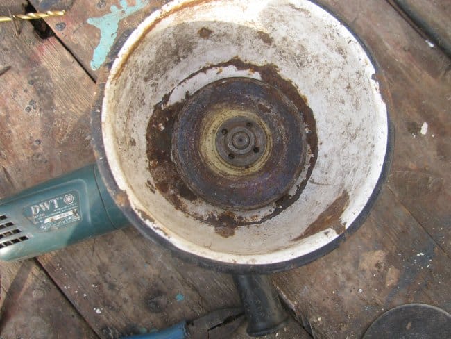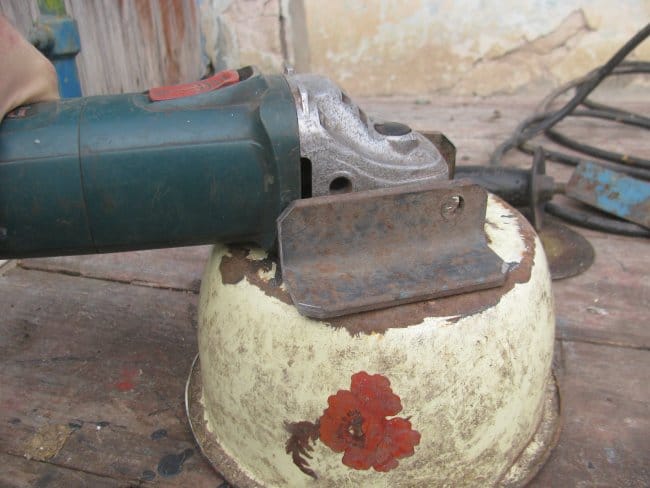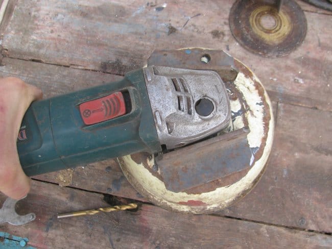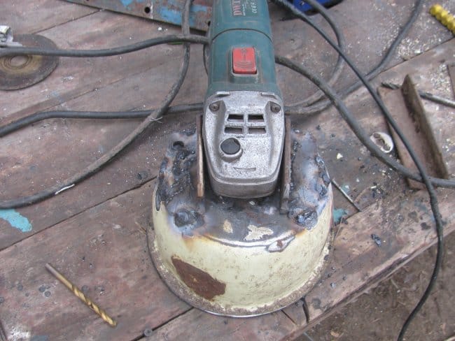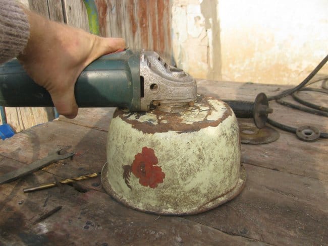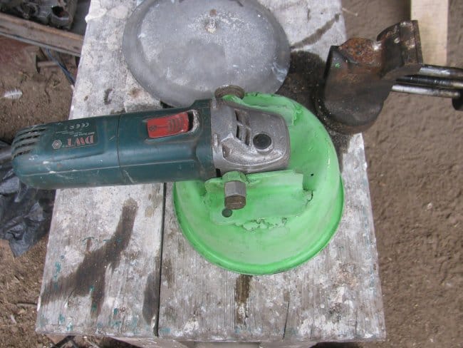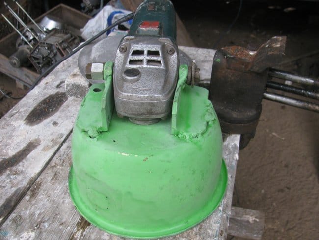 В днище нашел на глаз центр и просверлил отверстие под вал болгарки. Сверлил дрелью и сверлом на 10, а дальше работал сверлом как фрезером, рассверлил до нужного мне диаметра.