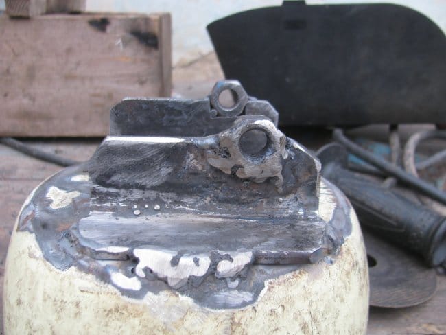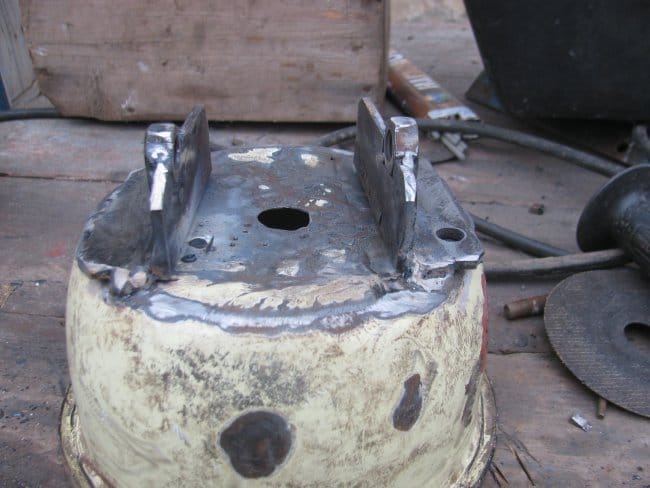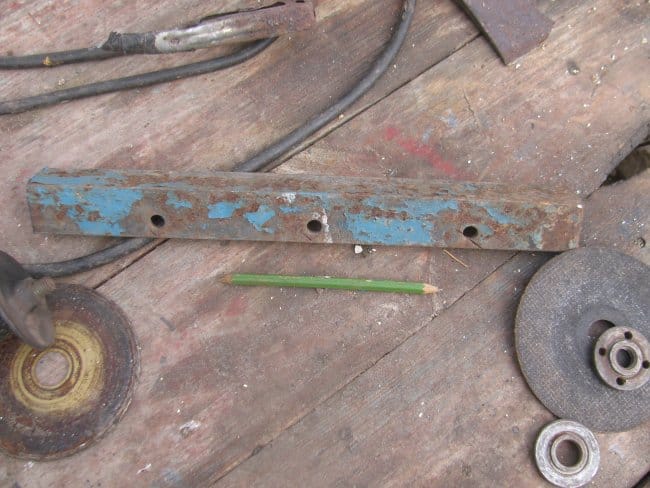 В качестве крепежей нашел куски уголков от старой кровати, они оказались узковатыми, поэтому приварил к уголкам гайки, в которые и будут вставляться болты. Уголки я приварил к черпаку обычным инверторным сварочным аппаратом и электродом тройка. Сталь там очень тонкая, просто коротким касанием электрода навариваете точки, а поэтом к ним уже можно легко приварить сам уголок.