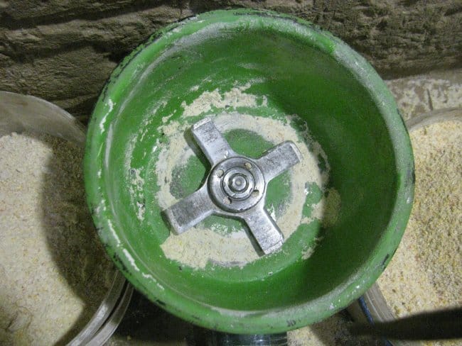 Крышка для мельницы не нужна, просто нужно экспериментальным путем понять, сколько сыпать в нее зерна. Нож должен быть полностью покрыт, тогда ничего не летит. Если зерно при работе перемешивается слабо, можно немного выгнуть лопасти, две опускаем вниз, и две немного приподнимаем.