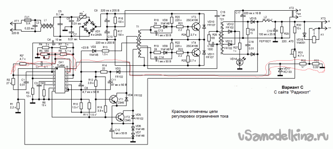 Красным отмечены цепи регулировки ограничения тока. В этой схеме датчик тока имеет на порядок меньший номинал, соответственно, меньше потери. Используется незадействованный ранее ОУ (входы 15,16), меньше дополнительных деталей. Однако введение и настройка дополнительных цепей коррекции ОУ – кропотливая операция и не всегда удается.