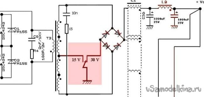 Конденсаторы даже в ЗУ, где напряжение не превышает 15…16 В, желательно ставить 25-вольтовые. Попадались рекомендации - вместо одного конденсатора большой емкости ставить несколько штук меньшей емкости, типа при этом улучшается охлаждение и параллелится ESR. Возможно, только места обычно не хватает. Диоды применяю КД213 (до 10 А) и КД2997 (до 30). В дросселе групповой стабилизации используется бывшая 5-вольтовая обмотка. Вообще от ДГС отказываться не стоит, хоть он и греется неслабо, без него ухудшается режим работы входных транзисторов и увеличивается их нагрев.