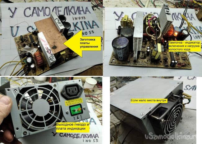 А теперь о модульности изделий. Под словом «модуль» подразумевается функционально законченная электронная схема, которая физически может быть расположена на одной плате, в составе другой платы либо раскидана по нескольким платам. Основной модуль изготавливается из компьютерного БП, построенного на ШИМ-контроллере 494 или его аналоге.
