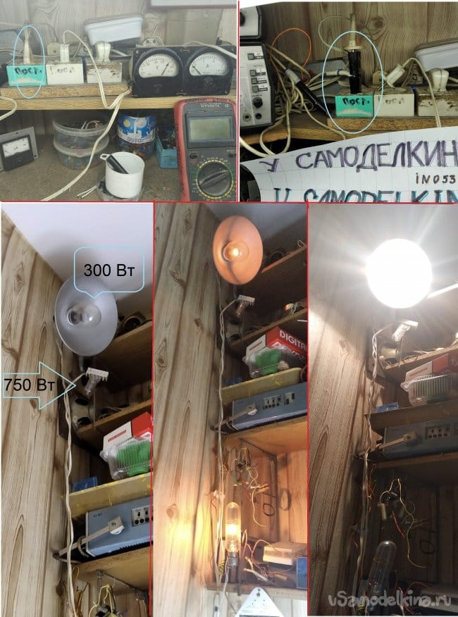 И последнее. Для многих конструкций первое включение бывает и последним, по себе знаю. Широко распространенная рекомендация: первое включение изделия в сеть - последовательно с лампой накаливания. Я много лет использую этот метод следующим образом. На верхнем левом снимке видим удлинитель на три розетки. Правая, чумазая, включена обычным образом, а левая, зеленая, и средняя, включены последовательно. В среднюю через амперметр и вольтметр включается розетка для подключения испытываемых конструкций. Но чтобы в ней появилось напряжение, необходимо в левую включить лампочку. Их у меня 3 штуки – на 100, 300 и 750 Вт. Включать лампочки можно в любой комбинации – на левом фото включена одна, на правом – все три. Лучшие для этой цели – галогенки, у них малое сопротивление в холодном состоянии и резкое увеличение его – до 10 крат – в рабочем.