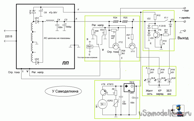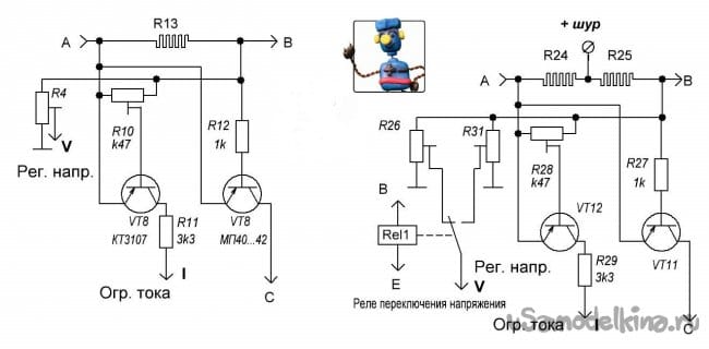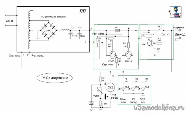 Следует отметить, что для схем БПШ и БПУ, так как в них не используется индикация тока зарядки, правильнее было бы использовать схему ограничения тока из ЗУ с сайта «Радиокот», автор кто-то из зубров - Бородач (borodach) или Старичок (Starichok51), а может, Фалконист (falkonist), не помню…