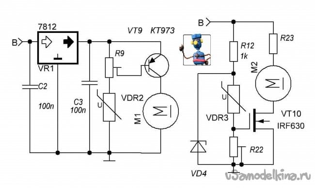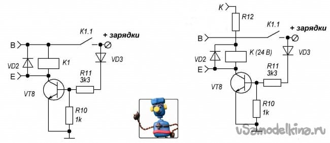 Вариант (справа) – использование реле на 24…27 В. При этом необходимо в выпрямитель добавить две детали. Резистор R12 подбирается под конкретные режимы.